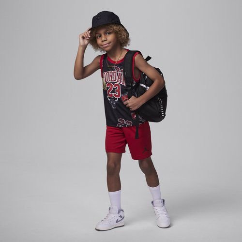 Dale a tu hijo un look deportivo y urbano con este conjunto Jordan 23 para niño, inspirado en el legado del mejor jugador de la historia. Incluye camiseta sin mangas y short a juego, perfectos para comodidad y estilo.