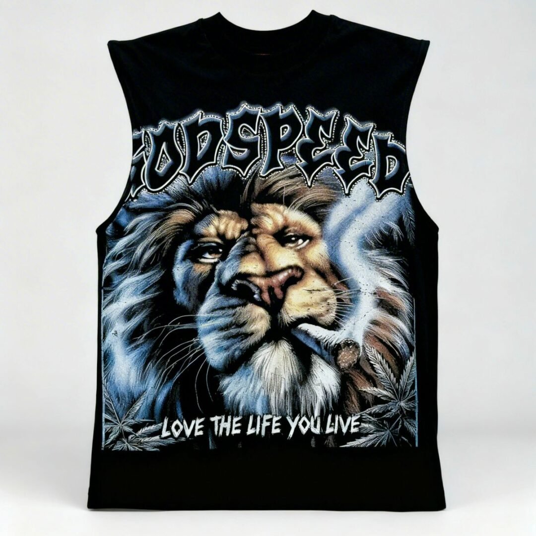 Camiseta sin mangas de estilo urbano, elaborada en algodón 100% de 300 gramos, perfecta para quienes buscan una prenda pesada, resistente y con un diseño artístico de alto impacto.