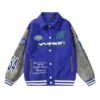 El brazo izquierdo muestra la palabra “Paris”, mientras que el derecho exhibe un parche rectangular en blanco y negro, añadiendo más elementos gráficos característicos de la marca. Los ribetes del cuello, puños y cintura vienen en un diseño de rayas blancas y negras, típico del estilo universitario. Con su mezcla de texturas, gráficos y proporciones amplias, esta prenda encarna el estilo atrevido y contemporáneo que define a Balenciaga.