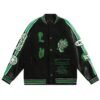 Las mangas y el cuerpo incluyen múltiples parches bordados: números, logotipos, gráficos inspirados en la herencia de la casa y referencias a 1854, el año de fundación de Louis Vuitton. También incorpora personajes animados bordados en la parte frontal que añaden un toque juvenil y dinámico. Los puños, el cuello y la parte inferior cuentan con ribetes elásticos a rayas en tonos neutros, manteniendo la estética tradicional del varsity jacket.